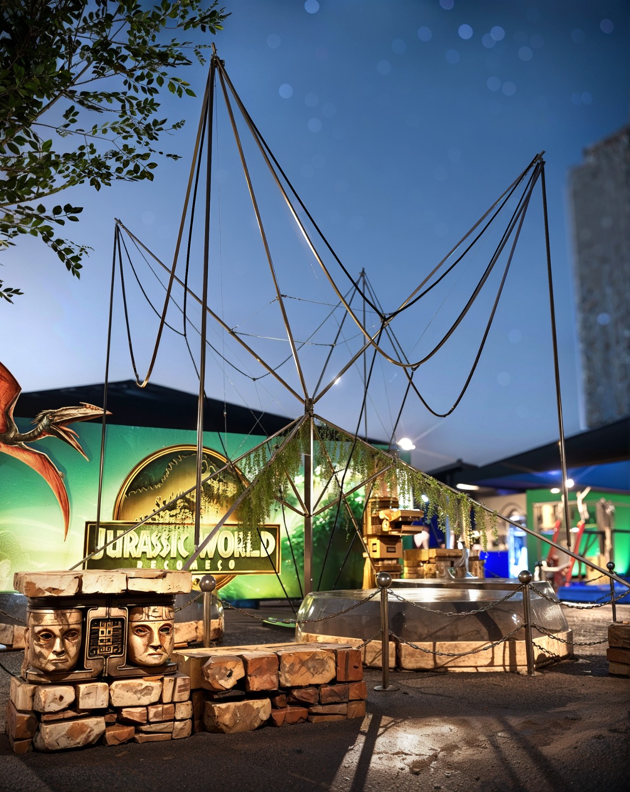 Cenários imersivos + dinossauros hiper-realistas + experiências sensoriais.