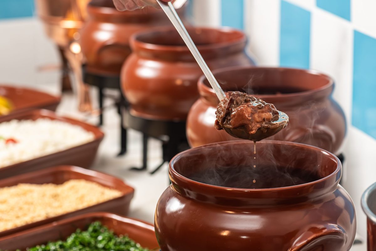 O cardápio inclui não apenas a tradicional feijoada preparada com carnes nobres selecionadas, mas também o clássico mocotó bovino, cozido lentamente com feijão branco e linguiça paio. O buffet é complementado pelos acompanhamentos tradicionais: arroz branco, couve mineira refogada, farofa de alho, barriga de porco e laranja fresca para equilibrar os sabores.