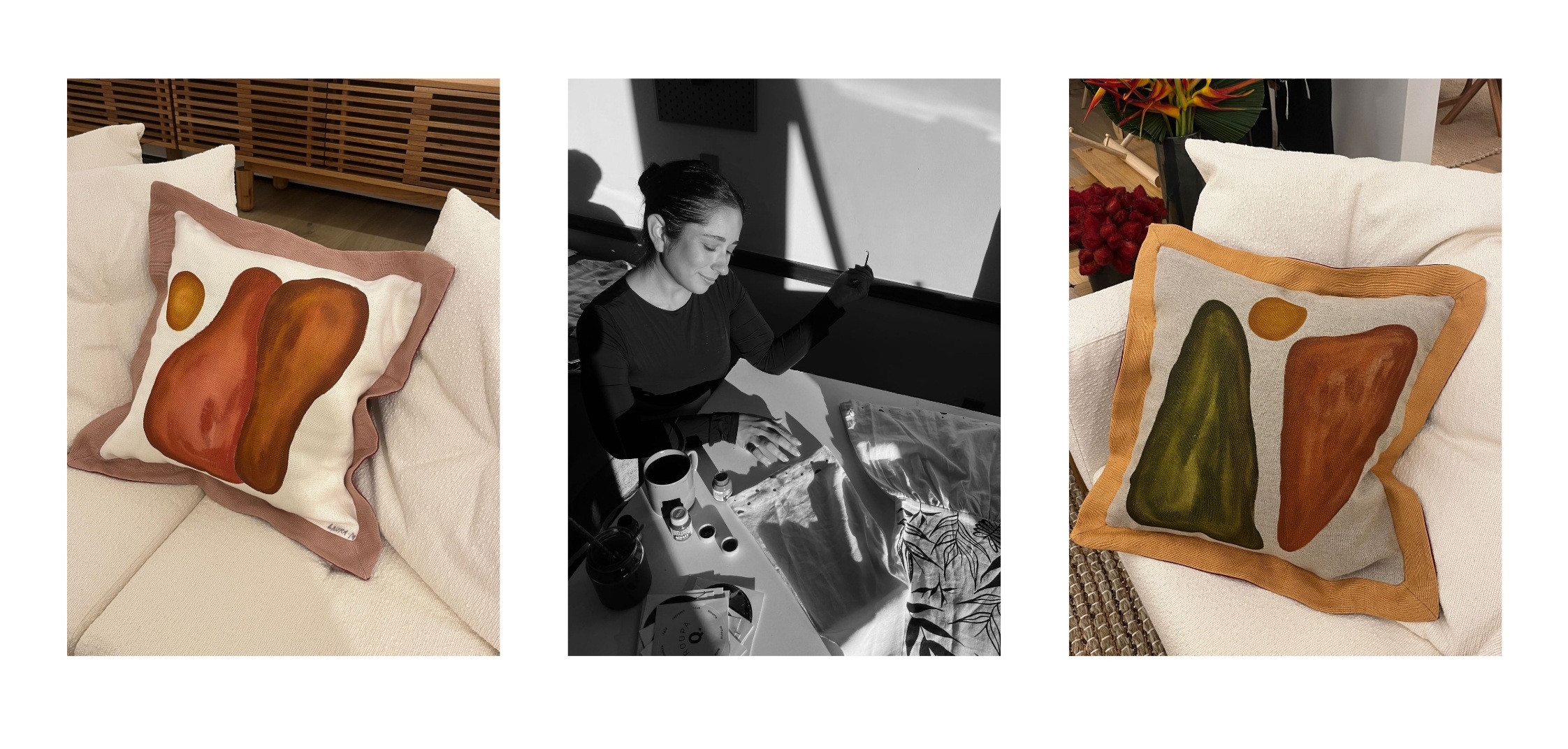Com o passar do tempo, o trabalhado com peças de roupa migrou para o vestuário da casa e o mundo da decoração ganhou espaço dentro das suas preferências: Pinturas em sofás, paredes, almofadas, murais… Com uma vertente que mescla vestuário, arquitetura e decoração, em 2023 participou da exposição Casa Cor e fez parcerias com diversas marcas. “Uma pessoa que conheci me colocou em contato com a arquiteta Paula Neder, que queria almofadas pro espaço que ela estava construindo na Casa Cor, então fiz um trabalho em parceria com a loja ‘Trama Casa’. Foi uma experiência incrível, me deu visibilidade no mercado e talvez tenha sido a virada de chave para eu começar a focar mais no mundo da decoração e me dedicar apenas às artes plásticas”, destaca Laura, que até então também trabalhava em agências como designer.