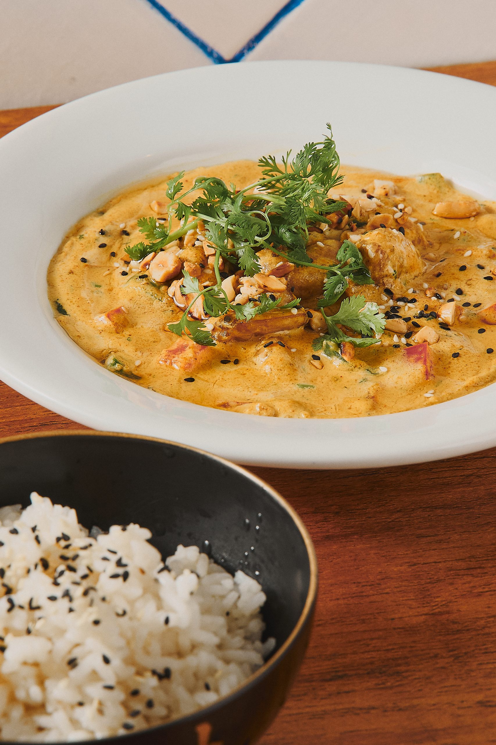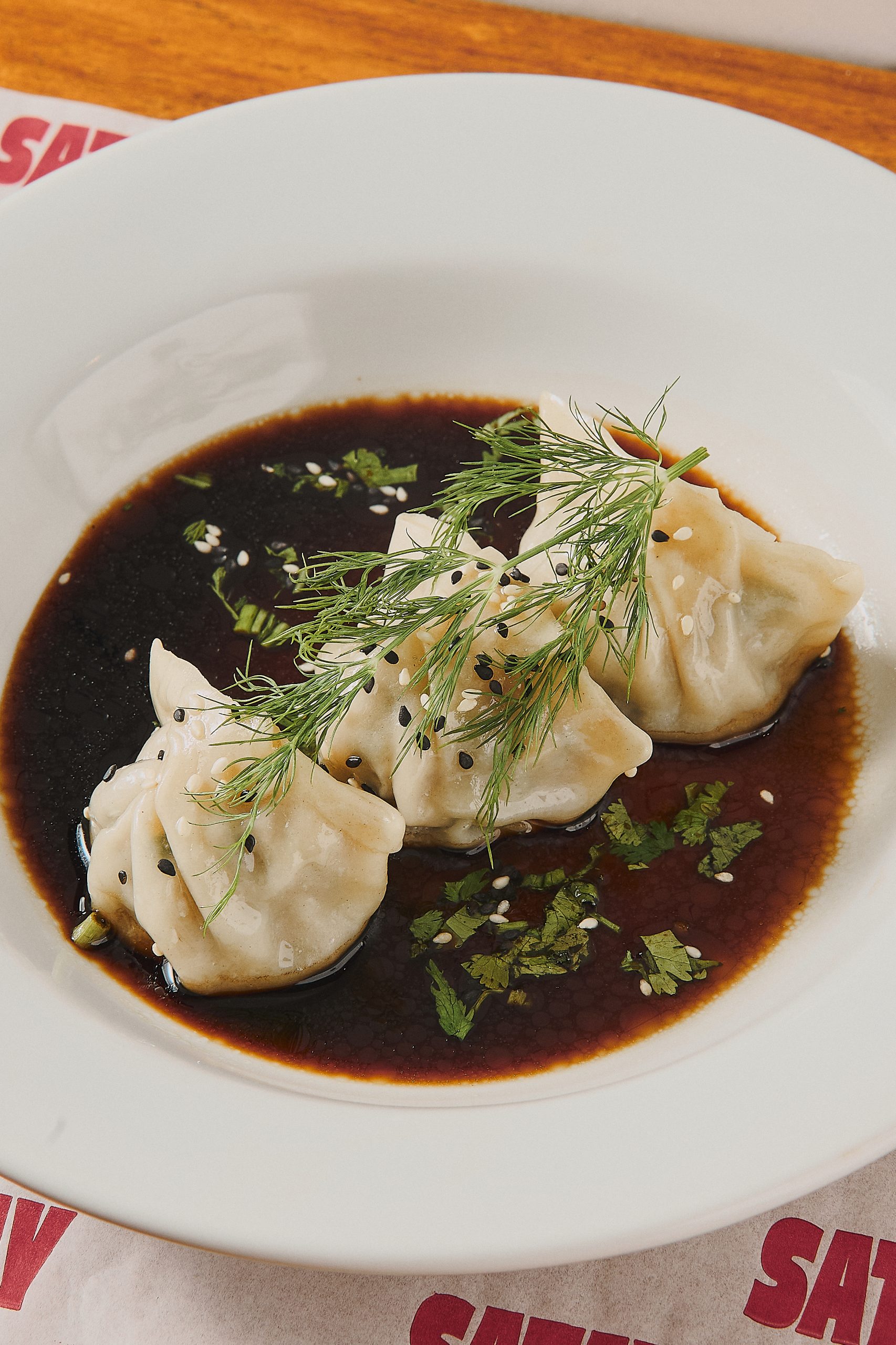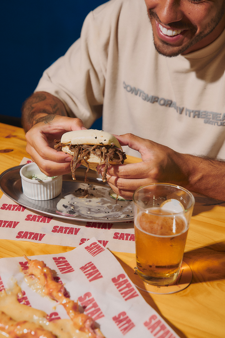 No menu, a estrela é o Satay Clássico, servido em versões de frango, camarão ou mignon, acompanhados do tradicional molho de amendoim. A partir daí, o cardápio se desdobra em uma seleção de hits da comida de rua asiática, reinterpretados com técnica e sabor. Entre as entradas, destaque para o ovinho frito marinado com aioli picante de gochujang, e para os baos, pãezinhos de origem chinesa servidos no vapor com recheios variados: porco com picles e aioli de gengibre e costela desfiada com kimchi e aioli de alho assado, e a versão vegetariana, com cogumelos salteados e toque de coentro.