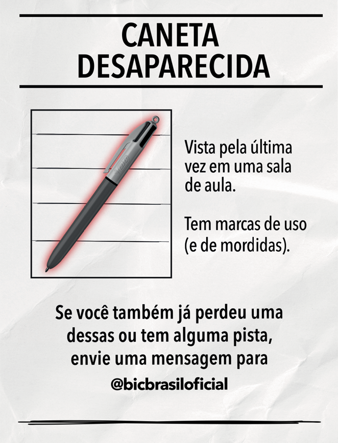 “Queremos provocar a curiosidade das pessoas e criar uma conversa cultural em torno da marca. O desaparecimento das canetas é o ponto de partida para uma jornada de mistério que será desvendada ao longo da campanha. Essa é uma forma de mostrar que a BIC pode surpreender e se conectar de maneira criativa com os consumidores”, afirma Rodrigo Iasi, Diretor de Marketing da BIC Brasil e Argentina.