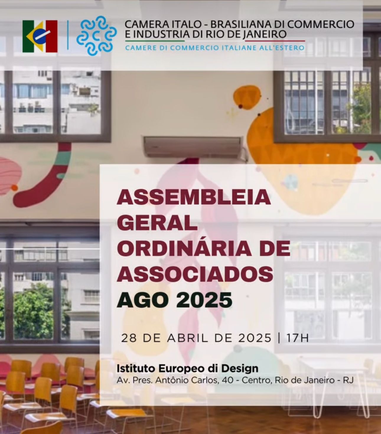 A Câmara Ítalo-Brasileira de Comércio e Indústria irá a Assembleia Geral Ordinária –– AGO 2025. O evento anual ocorre no dia 28 deste mês, no IED Rio , e reúne a comunidade empresarial ítalo-brasileira em um encontro estratégico ao fortalecimento de relações institucionais, apresentação de oportunidades e eleição do novo Conselho de Administração da Câmara.