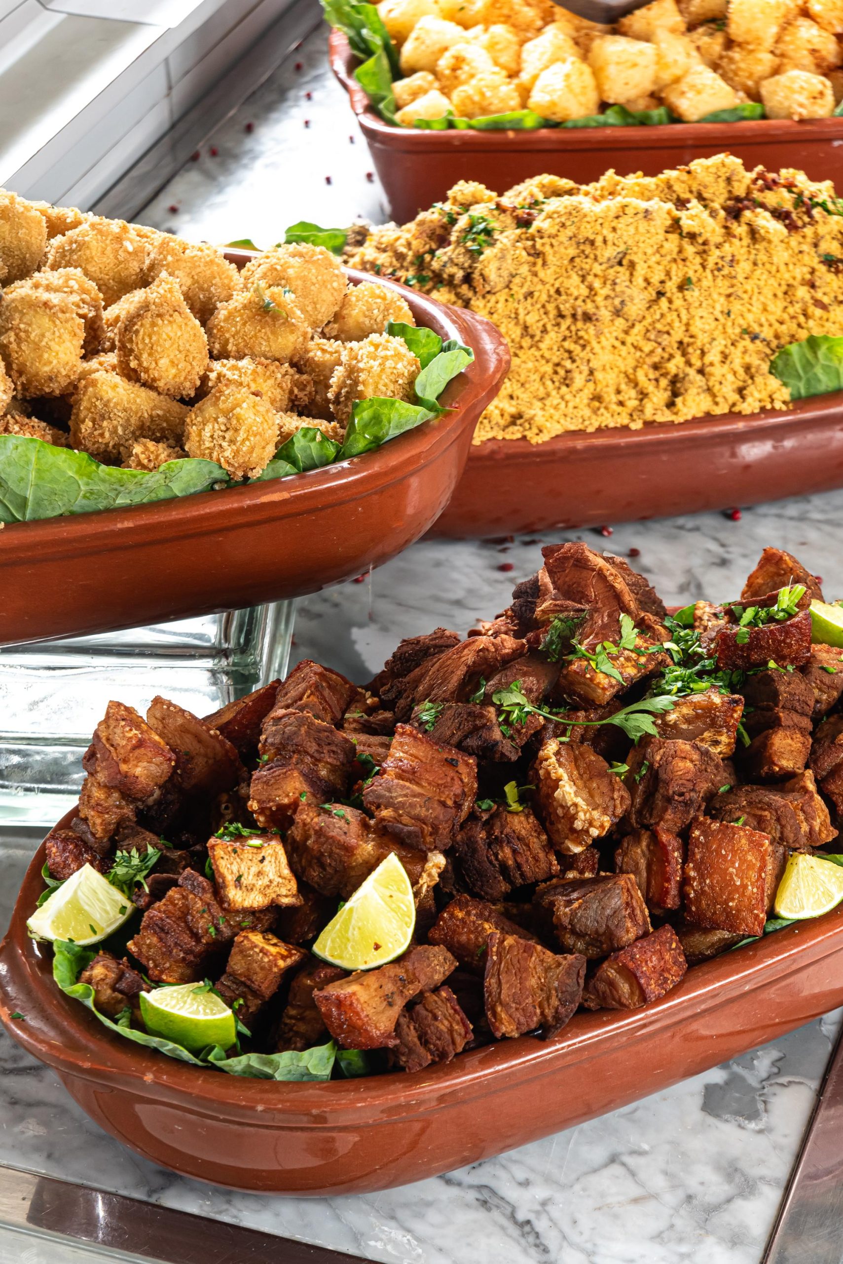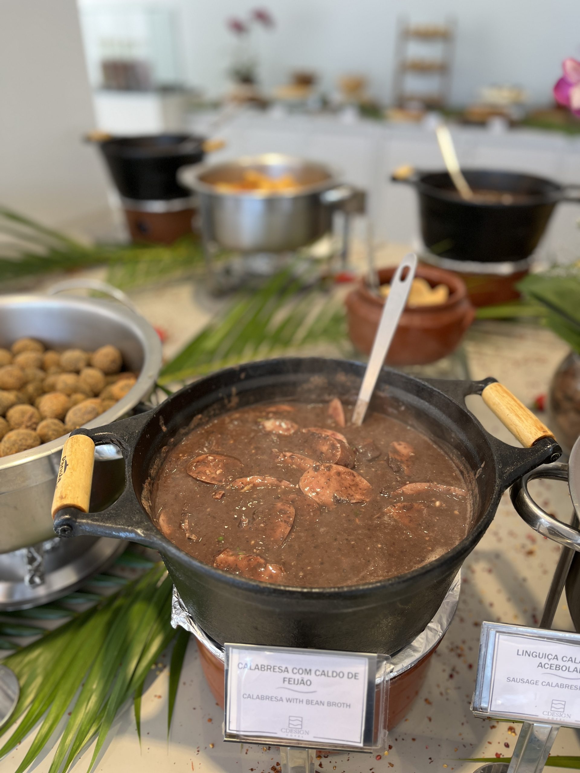 O destaque do evento é o buffet liberado de feijoada, servido à vontade, com uma seleção generosa de carnes salgadas como carne seca, lombinho suíno, linguiça, paio, bacon e costela de porco. Para acompanhar, não faltam os clássicos que fazem toda a diferença: torresmo crocante, farofa, couve mineira refogada e arroz branco soltinho. Antes de mergulhar na feijoada, os convidados podem aproveitar uma estação de saladas, e, para encerrar a experiência com chave de ouro, uma mesa de sobremesas reúne opções irresistíveis. Entre as bebidas inclusas, estão chopp Amstel liberado, além de água, sucos, refrigerantes e caipirinha de limão, garantindo brindes à altura da ocasião.