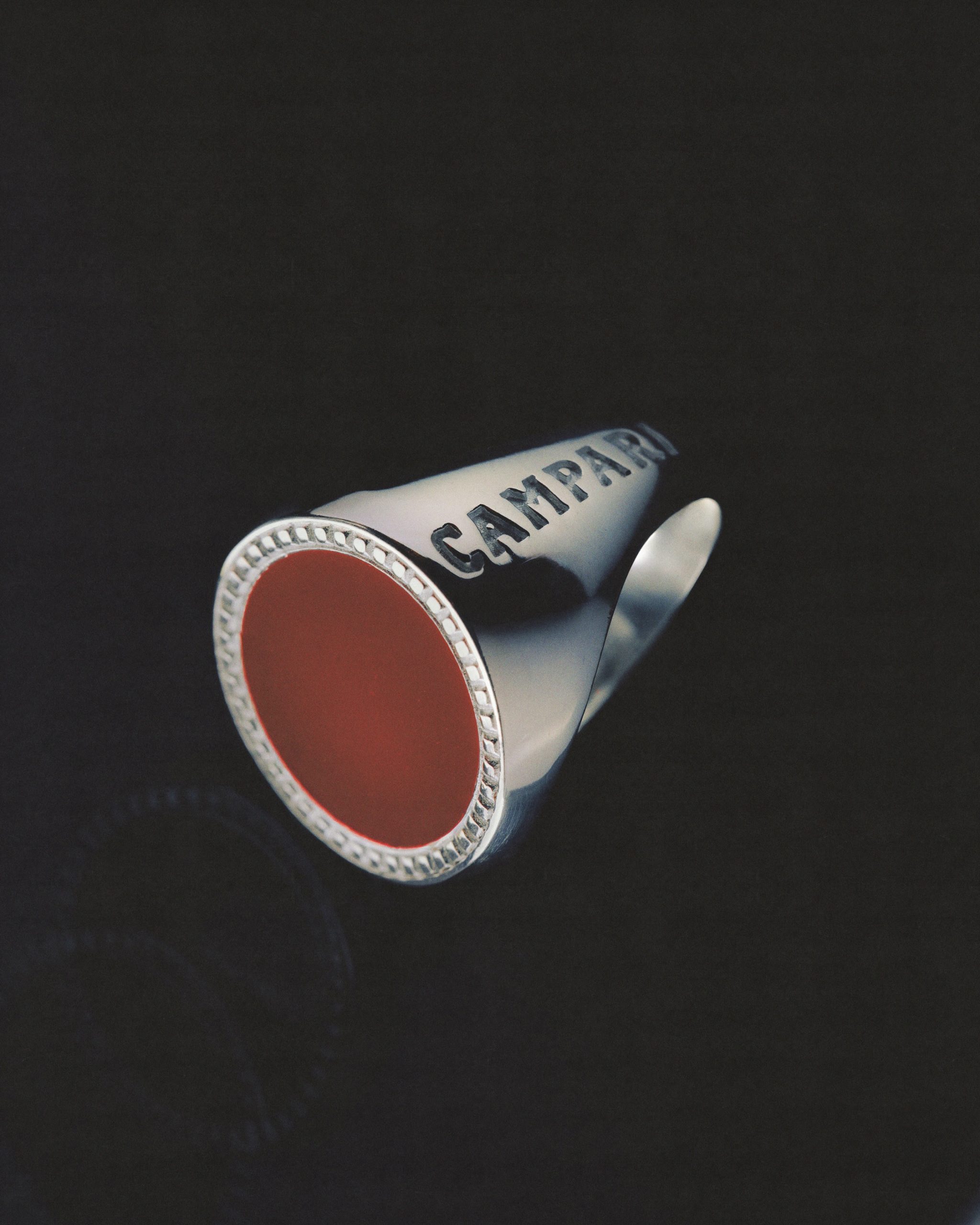 O vermelho escuro do Negroni, drink mais consumido do mundo e feito essencialmente com Campari, ganhou vida nas composições gráficas da jóia, criando uma identidade visual que dialoga com a linguagem contemporânea da moda. Vista de cima, a peça se assemelha a um copo de Negroni, trazendo essa referência de forma sutil e sofisticada ao design do anel. Não é apenas sobre estética – é sobre criar conexões genuínas com a cultura atual, demonstrando que tradição e modernidade podem coexistir de forma natural.