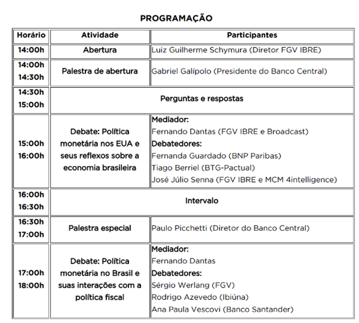 Os debates serão distribuídos em dois blocos, com três debatedores em cada um. O tema central do primeiro bloco será a política monetária dos Estados Unidos e seus reflexos na economia brasileira. No segundo, o foco será política monetária no Brasil e suas interações com a política fiscal. Nos dois casos, a mediação das discussões será feita pelo jornalista Fernando Dantas, coordenador do Blog do Ibre e colunista do Broadcast.