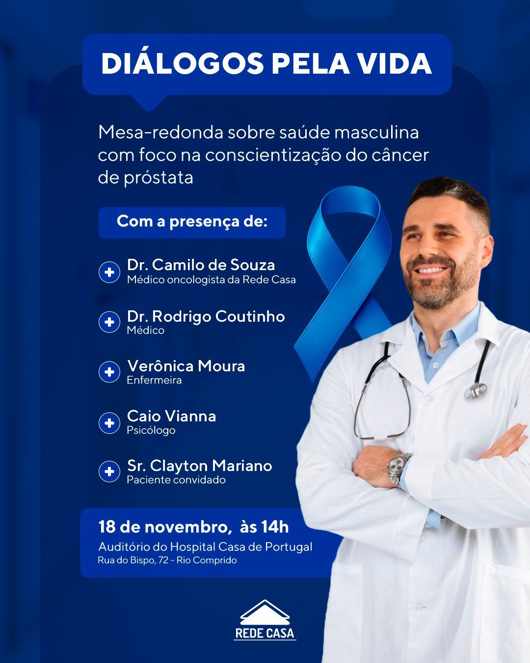 Na próxima terça-feira, 18 de novembro, às 14h, o Hospital Casa de Portugal, da Rede Casa, realiza um debate gratuito e aberto ao público sobre a importância do cuidado com a saúde do homem, em alusão ao Novembro Azul.