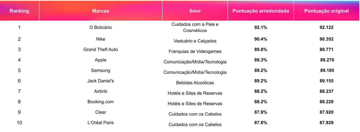 O setor de bebidas alcoólicas também figura entre os destaques: Samsung e Jack Daniel’s, disputam até os milésimos, com 89,185 e 89,155 respectivamente. Plataformas digitais de hospedagem como Airbnb e Booking.com também travam disputa acirrada: o primeiro com 88,237 e o segundo com 88,229. Marcas de cuidados capilares como Clear e L’Oréal Paris fecham o Top 10 do ranking com 87,9 e 87,8 respectivamente.