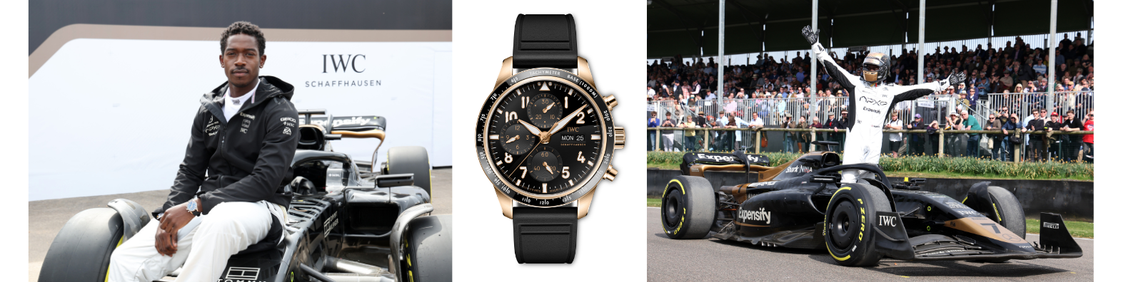 Destaque para o relógio IWC Pilot Performance Chronograph 41 com caixa em ouro 18 quilates, fundo de caixa de safira, mostrador laqueado preto e uma luneta taquimétrica de cerâmica preta.  Ele é usado pelo personagem de Damson Idris, Joshua Pearce.
