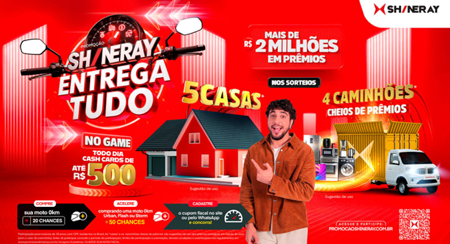 A Shineray do Brasil estreou recentemente sua nova campanha publicitária “Shineray Entrega Tudo”, protagonizada pelo cantor Nattan. Com investimento de R$20 milhões, a ação está presente em TV, rádio, outdoors e nas redes sociais da marca.