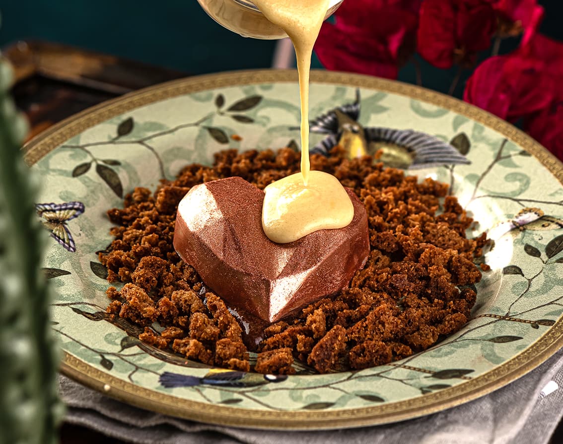 A criação da chef Helena Murucci é uma verdadeira experiência sensorial: um coração de chocolate branco recheado com mousse de chocolate meio amargo com crocante e um delicado creme inglês, servido morno. A combinação perfeita entre o doce e o intenso, assim como o amor.
